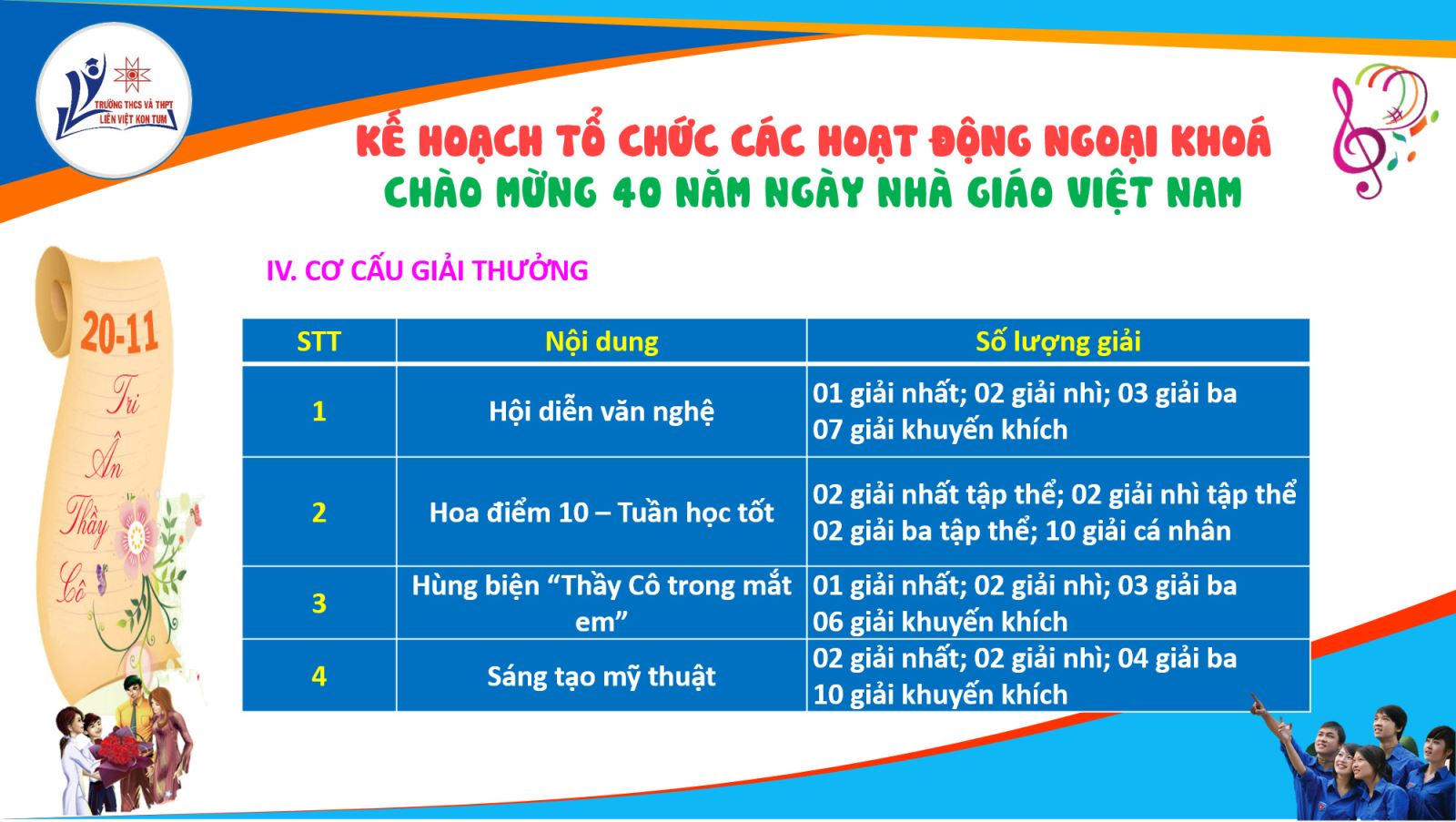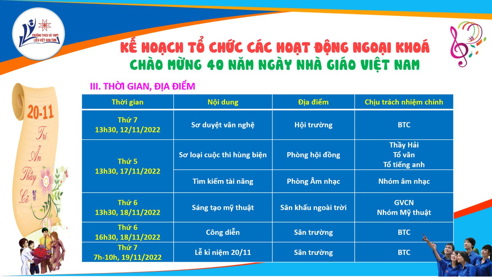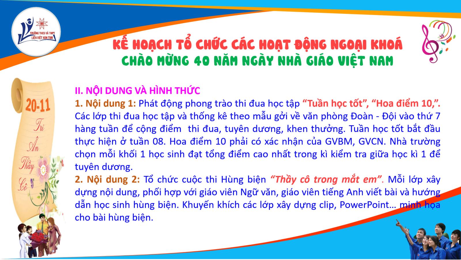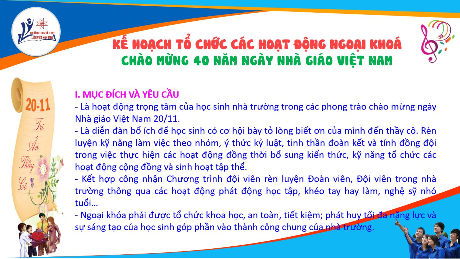 Kế hoạch tổ chức các hoạt động ngoại khóa chào mừng kỷ niệm 40 năm ngày Nhà giáo Việt Nam ( 20/11/1982 - 20/11/2022)