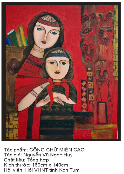 Bằng tình yêu với vùng đất Kon Tum và những con người miệt mài gieo chữ nơi vùng cao, thầy Nguyễn Vũ Ngọc Huy đã tạo nên tác phẩm hội họa đầy cảm xúc – Cõng chữ miền cao. Bức tranh là sự kết hợp tinh tế giữa chất liệu tổng hợp và bảng màu mang đậm âm hưởng Tây Nguyên, từ đó khắc họa hình ảnh cô trò nơi vùng khó với sự lạc quan, kiên trì và tràn đầy yêu thương.