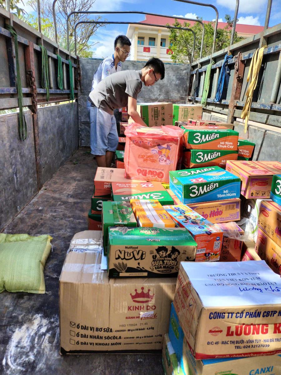 Hình ảnh: Học sinh trường THCS và THPT Liên Việt Kon Tum sắp xếp nhu yếu phẩm để vận chuyển ra các tỉnh phía Bắc bị thiệt hại do bão số 3 (YAGI) gây ra.