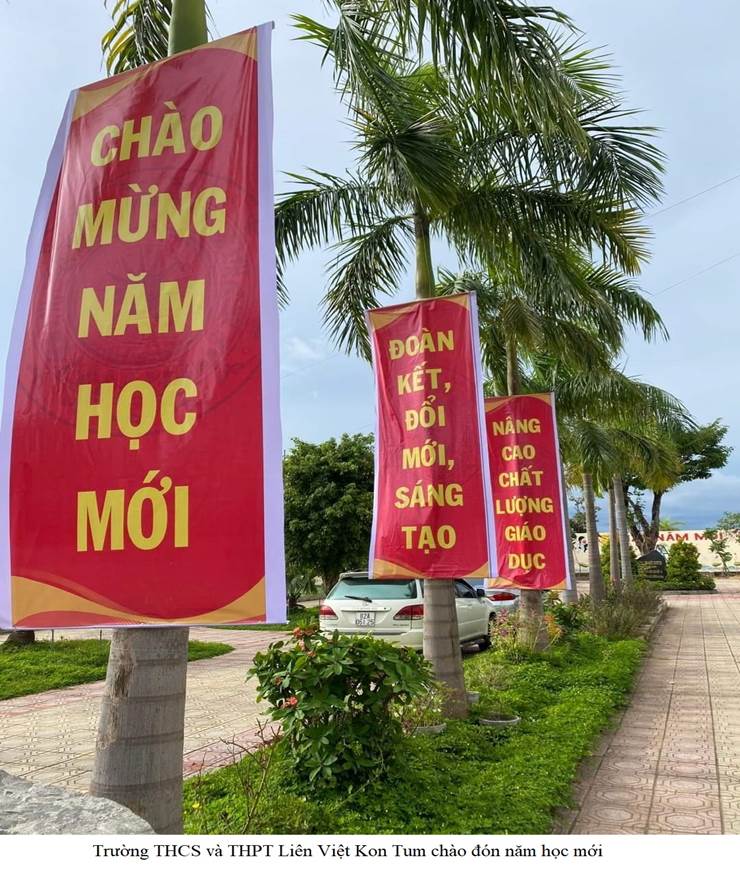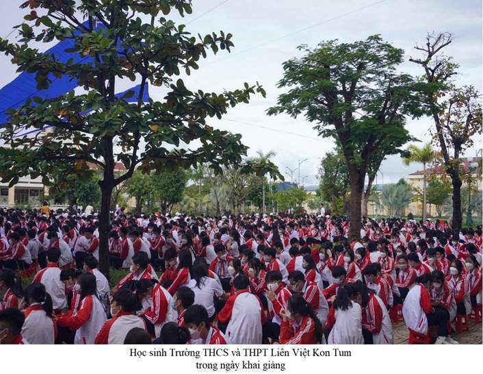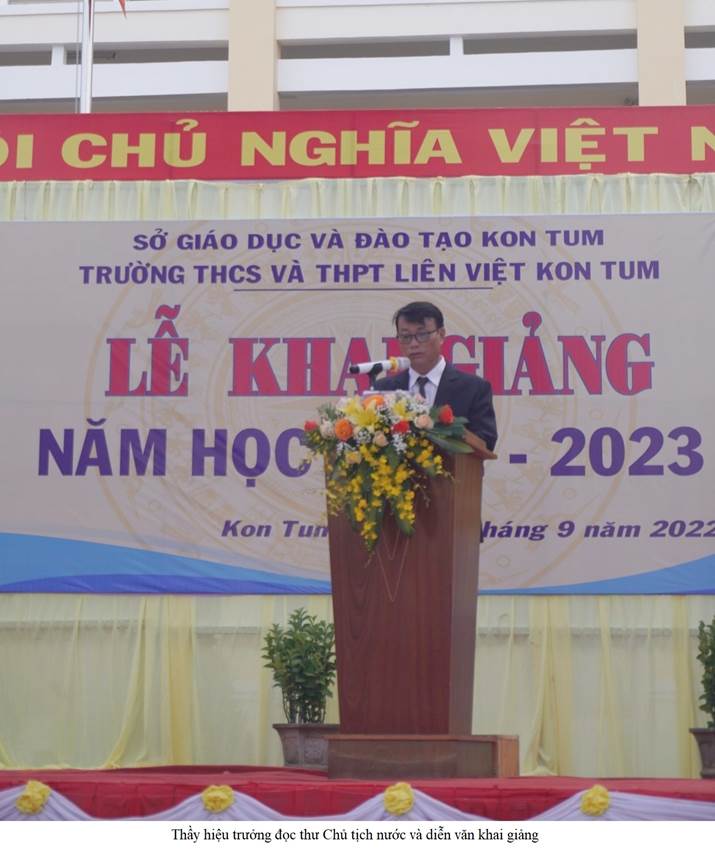 Sau nghi thức chào cờ, tiến sĩ Lê Đắc Tường – Bí thư Đảng bộ, Hiệu trưởng nhà trường đã đọc thư chủ tịch nước và diễn văn khai trường. Theo thầy Lê Đắc Tường, năm học 2021-2022 là năm học thật đặc biệt. Năm học mà ngành giáo dục tổ chức dạy học, giáo dục trong bối cảnh diễn biến hết sức phức tạp của đại dịch. Tuy vậy, với sự chỉ đạo chủ động, sáng tạo và quyết liệt của Sở GD&ĐT cùng với sự linh hoạt của các cơ sở giáo dục; trong năm học vừa qua giáo dục tỉnh ta đã gặt hái nhiều thành công và được dư luận xã hội ghi nhận, đồng thuận và ủng hộ. Năm học mới 2022 - 2023 là năm học đầu tiên trường THCS và THPT Liên Việt Kon Tum có đầy đủ các lớp từ lớp 6 đến lớp 12. Đây là nhiệm vụ rất nặng nề nhưng cũng rất vinh quang. với tiêu chí là trường Phổ thông công lập chất lượng cao, nhà trường xác định triết lí đào tạo: Học sinh có đạo đức tốt, trí tuệ đầy đặn, có nghị lực và kĩ năng trong bối cảnh hội nhập. Trong năm học này, nhà trường tập trung nâng cao chất lượng giáo dục, chú trọng rèn luyện đạo đức, đẩy mạnh việc dạy ngoại ngữ, tin học, tăng cường các hoạt động trải nghiệm, thiện nguyện…Hưởng ứng tâm thư của chủ tịch nước, thầy và trò trường THCS và THPT Liên Việt Kon Tum nguyện ra sức phấn đấu hoàn thành suất sắc chủ đề mà ngành Giáo dục đề, đó là “Đoàn kết, sáng tạo, ra sức phấn đấu hoàn thành tốt các nhiệm vụ và mục tiêu đổi mới, củng cố và nâng cao chất lượng giáo dục và đào tạo”.