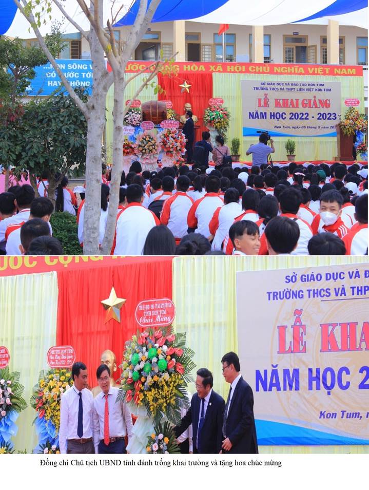 Trong buổi lễ khai giảng, nhà trường vô cùng vinh dự được đồng chí Lê Ngọc Tuấn, Phó Bí thư Tỉnh ủy, Chủ tịch UBND tỉnh Kon Tum đánh trống khai trường và tặng hoa chúc mừng. Ban giám hiệu nhà trường đã nhiệt liệt hoan nghênh và đón nhận tình cảm cùng với sự động viên của lãnh đạo tỉnh Kon Tum. Đây chính là nguồn động viên to lớn để thầy và trò trường THCS và THPT Liên Việt Kon Tum hoàn thành xuất sắc nhiệm vụ năm học 2022 – 2023.