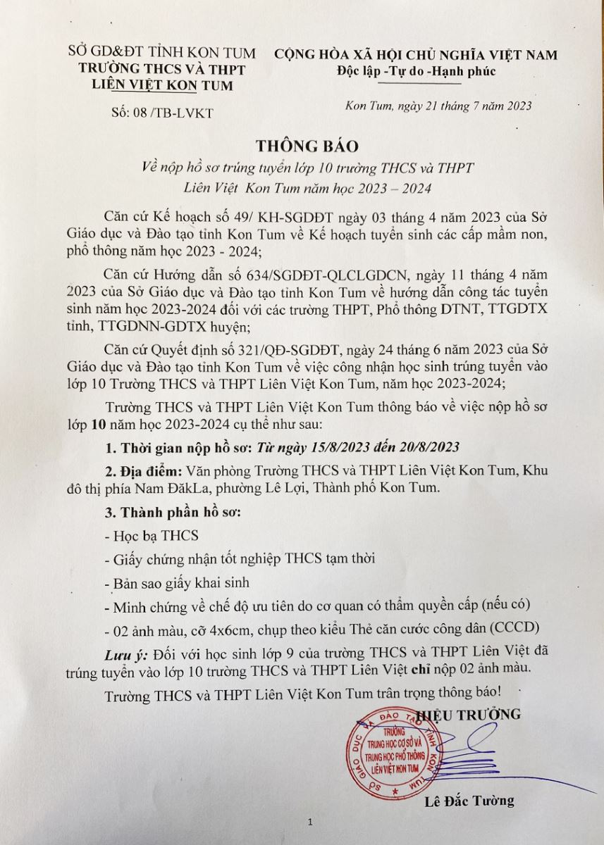 Thông báo về nộp hồ sơ trung truyển lớp 10, Trường THCS và THPT Liên Việt Kon Tum năm học 2023 - 2024