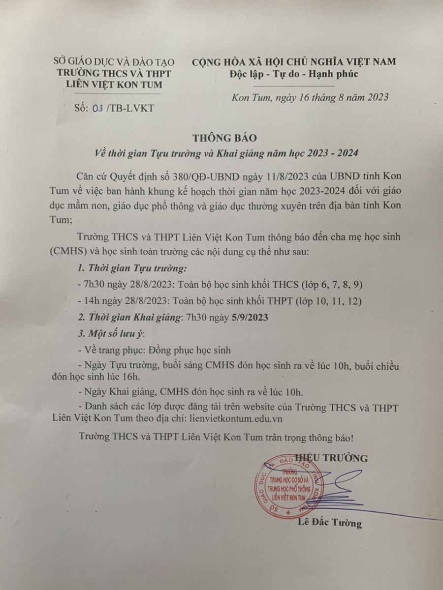 Thông báo về nộp hồ sơ trung truyển lớp 10, Trường THCS và THPT Liên Việt Kon Tum năm học 2023 - 2024
