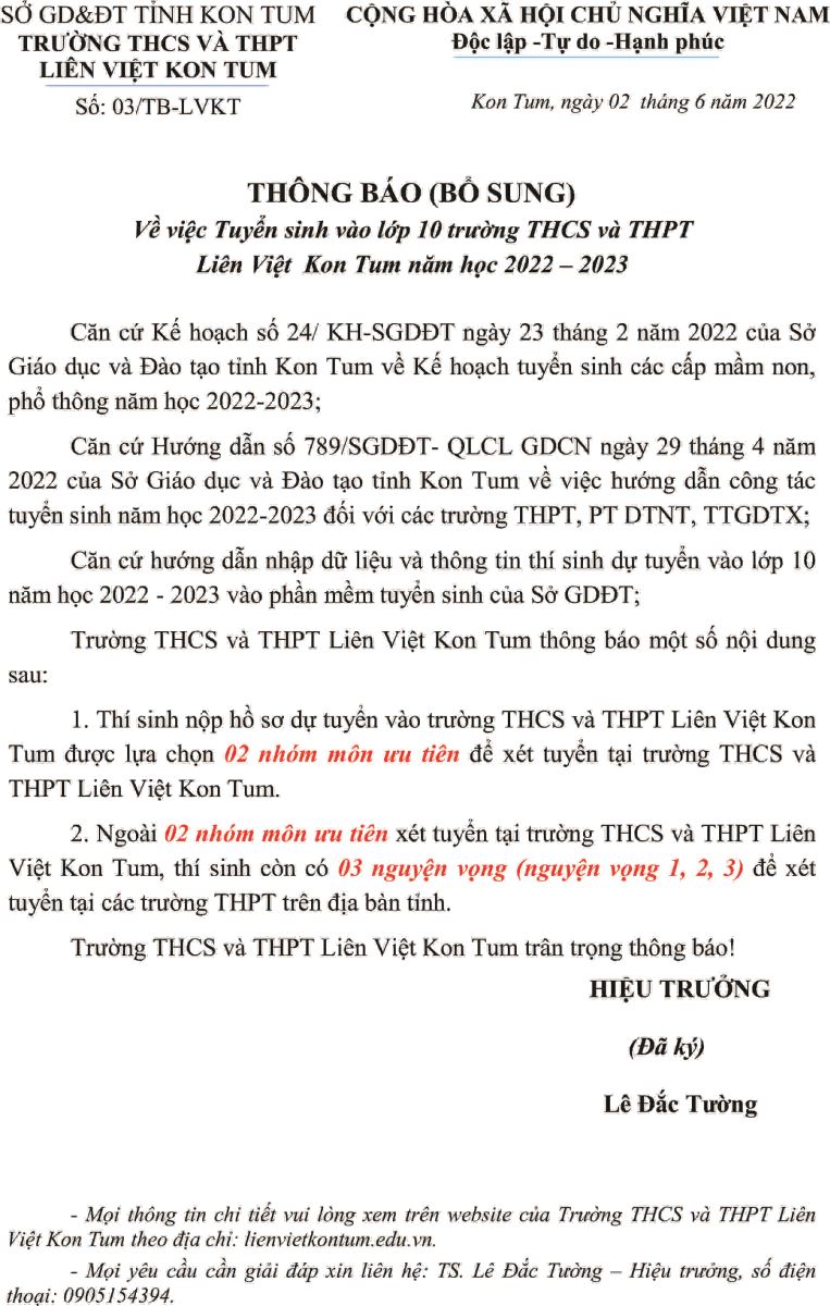 THÔNG BÁO BỔ SUNG VỀ VIỆC TUYỂN SINH VÀO LỚP 10 TRƯỜNG THCS VÀ THPT LIÊN VIỆT KON TUM NĂM HỌC 2022 - 2023